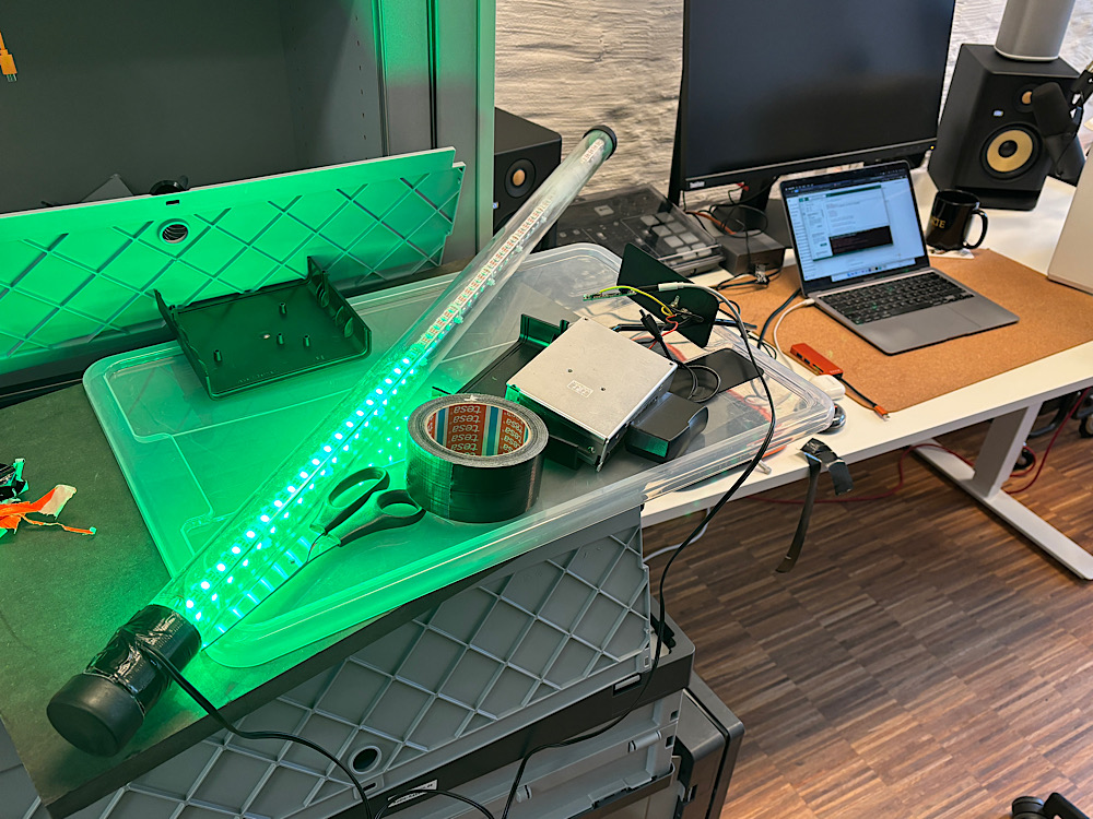 Ich hatte schon lange vor, mal eine leicht zu bedienende LED-Lampe für Lightning Talks zu bauen. Vor deer Pandemie hatte ich dazu schon 4x56 LED-Streifen in einem Acryl-Rohr verbaut und an einen Mikrocontroller angeschlossen. Jetzt habe ich die Gelegenheit gefunden, die Lampe endlich fertigzustellen.